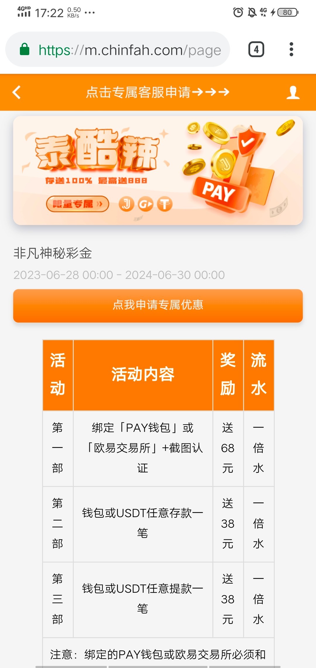 非凡娱乐有账号存款过的登录进去,我试过不同的号了,主页有“泰裤辣”活动页面就是可以百分百参加,如果没有这个页面就是不能参加了,绑定任何数字钱包提币链接送68,如果送的68赢了就提虚拟币还可以再领38,建议使用欧易,因为平台其他电子钱包都是50起,USDT的话可以10元起,把免费的68和38嫖完以后,如果赢了钱,就再用U充10几块钱进去,再领38,都是一倍水提,我两个号白嫖1700,第一个号就提了1500,可能是麻将放水,2块一拉给了五百倍