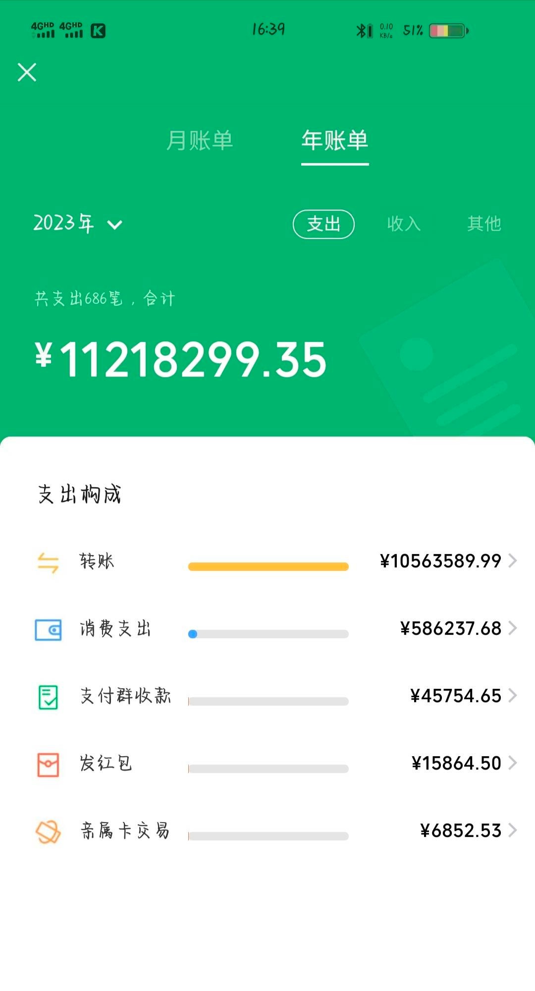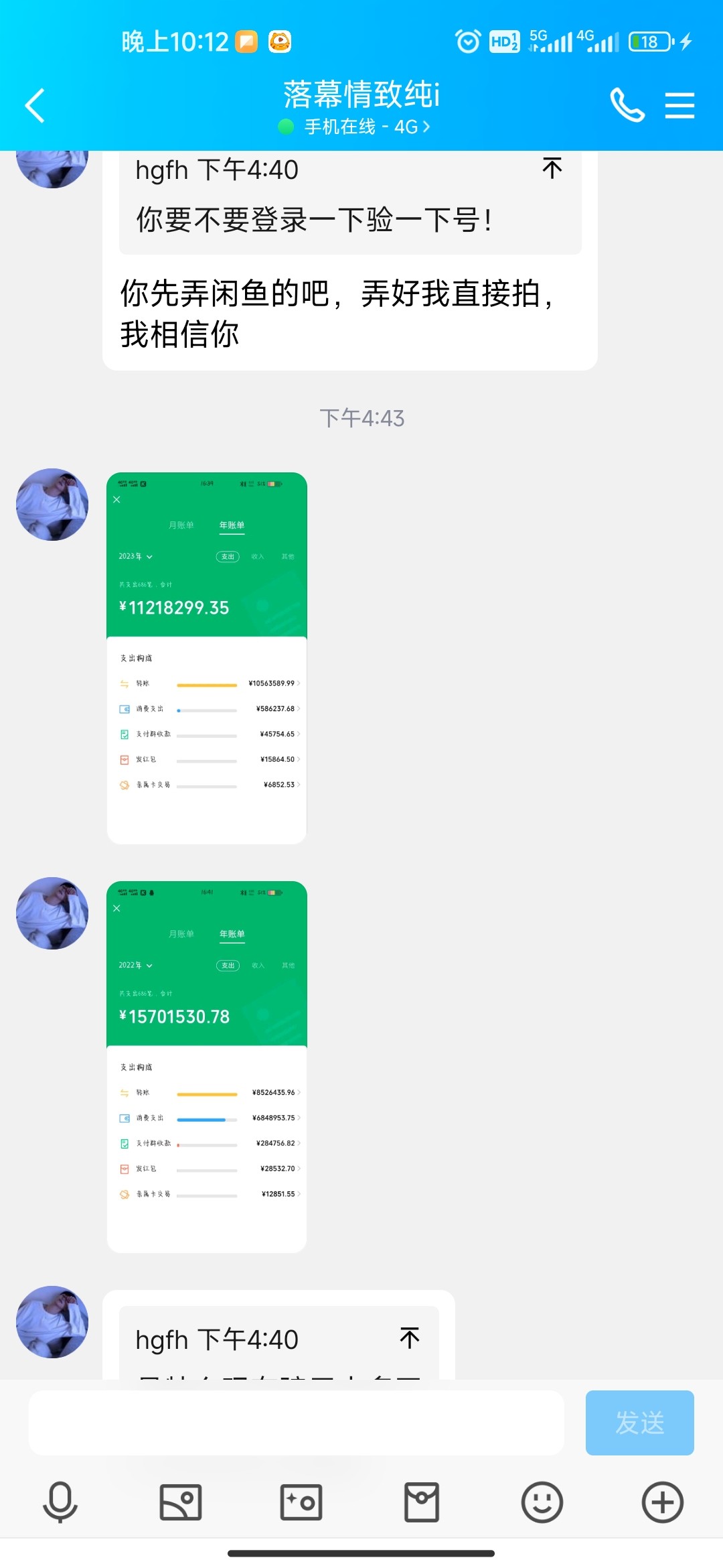 我前几天发帖问哪里有收微信的,这个人说他想要然后加上我了。不过脑子有点不清楚,用两个号加我两个qq,然后头像还是同一个。再然后就是加上了我qq之后,然后给我发了个微信账单,一共22年消费1500万,一共686也就是说没一次消费最低支付2万多。然后这个比还特么给我发了今年的年账单,也是686。哈哈哈哈笑死我,最开始还想骗我让我去淘宝开点他去拍。我没同意然后说又咸鱼结果就跑了哈哈哈哈。给你们看看他发的截图笑死我了。