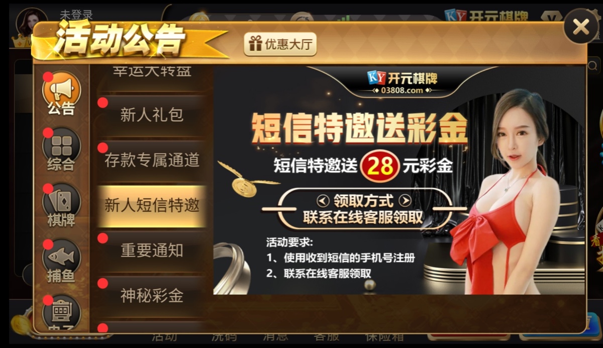 新用户注册完善资料,联系客服申请特邀彩金28,直接发手机号还有ID过去,不用短信。但是查特邀名单,反正我没有收到短信也送了。就算不送也没关系多注册这种平台特邀短信才多。