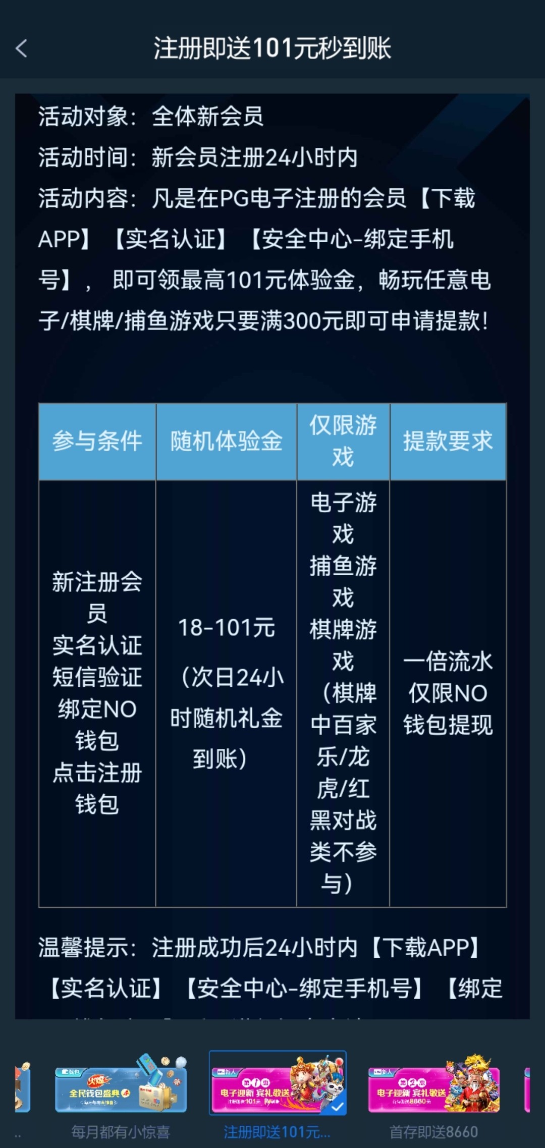 新用户下载APP注册完善资料绑定NO钱包24小时后次日派发18~101彩金限制电子捕鱼棋牌最低300提现