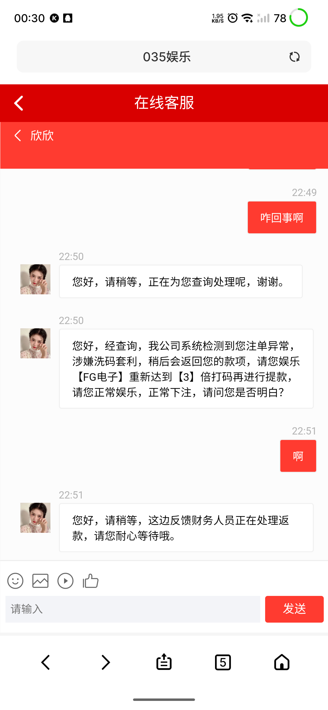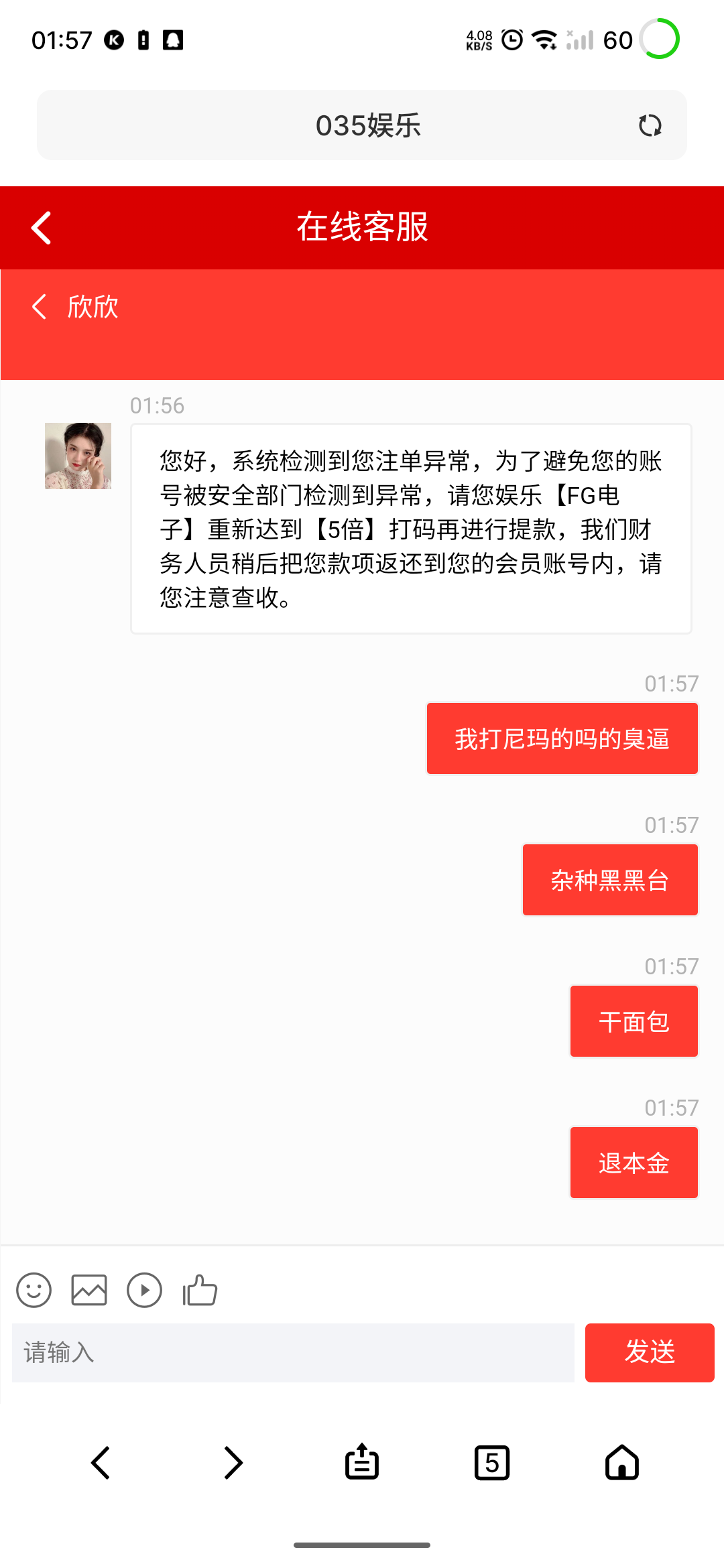 100十38打到650,提款,注单异常,套利,罚3水 FG电子,提现失败。打完fg罚开元捕鱼,3水,提现失败,再FG五水,我打他妈的臭逼。都注意035大黑比