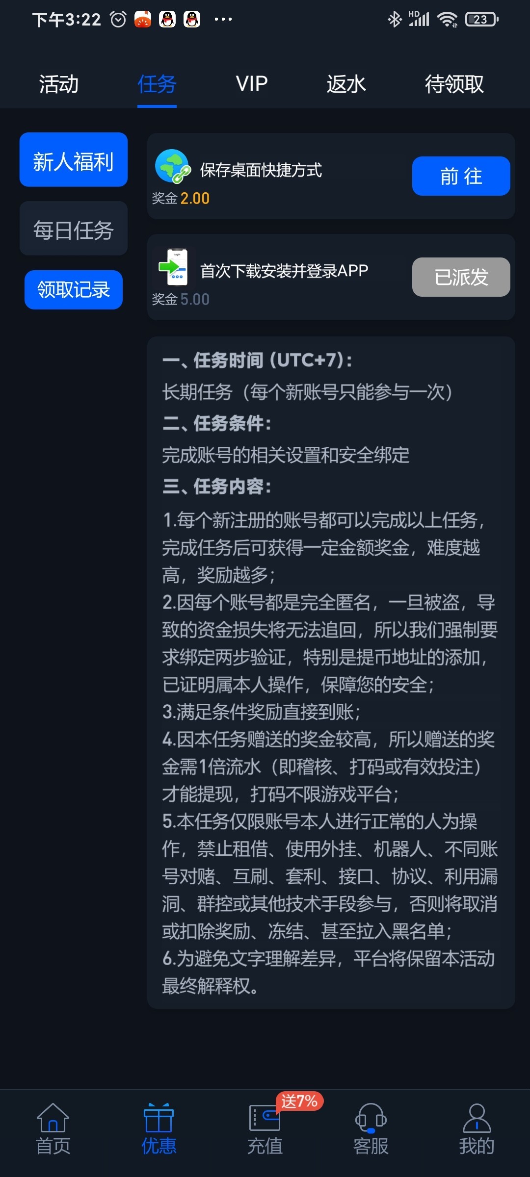 ③申请彩金:实名通过后联系钱包客服提供ab号申请彩金,联系后需要等待十几分钟,目前所有人都到了,没有不到的情况但是不敢保证,反正大概率能到(想下app的自己联系钱包客服要下载链接,好像不下载也没事,截图充值码然后点打开app会打开网页版登陆扫码就好)