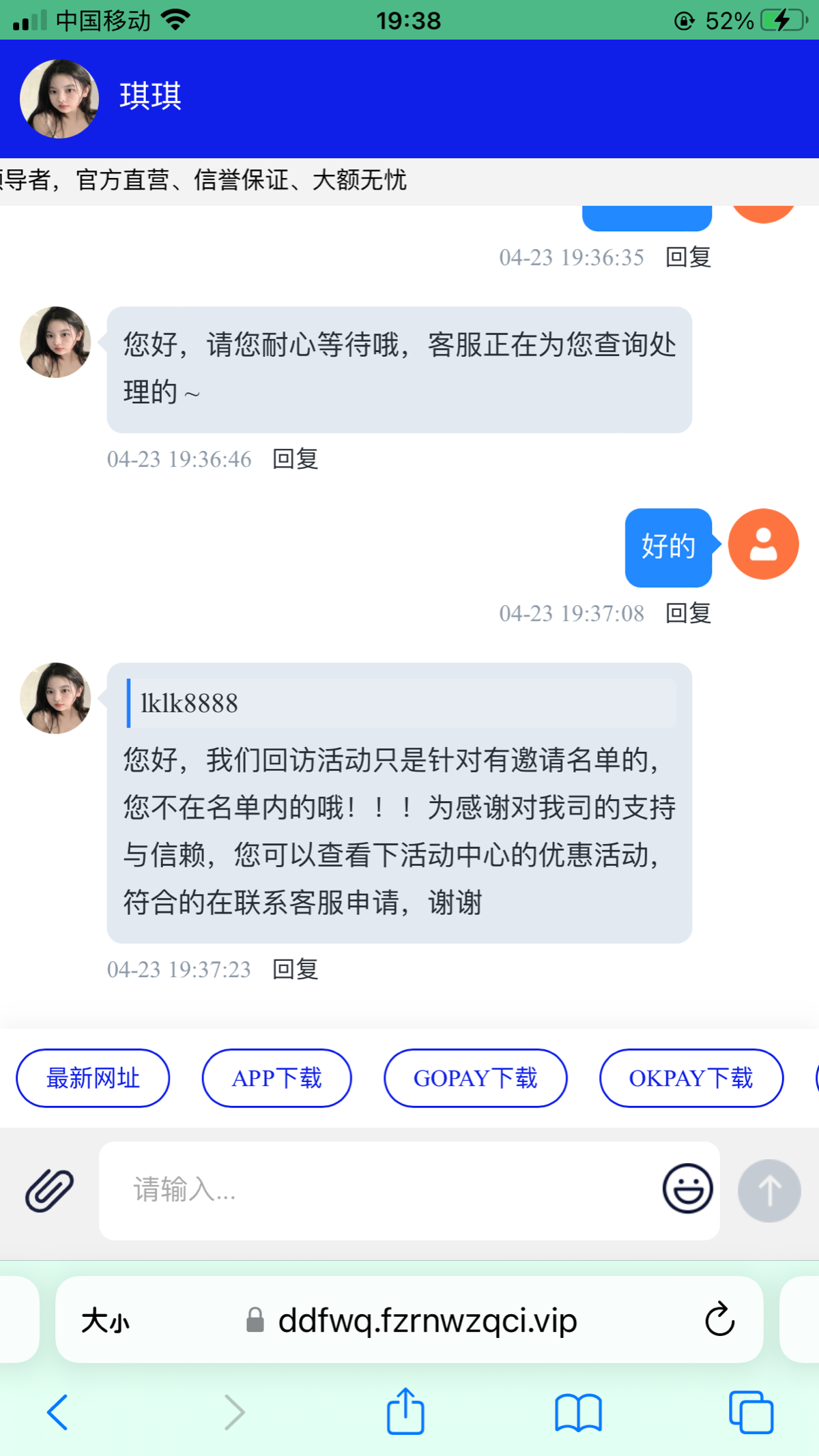 之前发过这个现在又有回馈了,老用户登录找在线客服随便提供一个境外截图说电话回访彩金,碰瓷试试碰到就是38彩金没注册的可以注册然后过几天去碰瓷回访彩金,具体自测吧切记勿充值。
