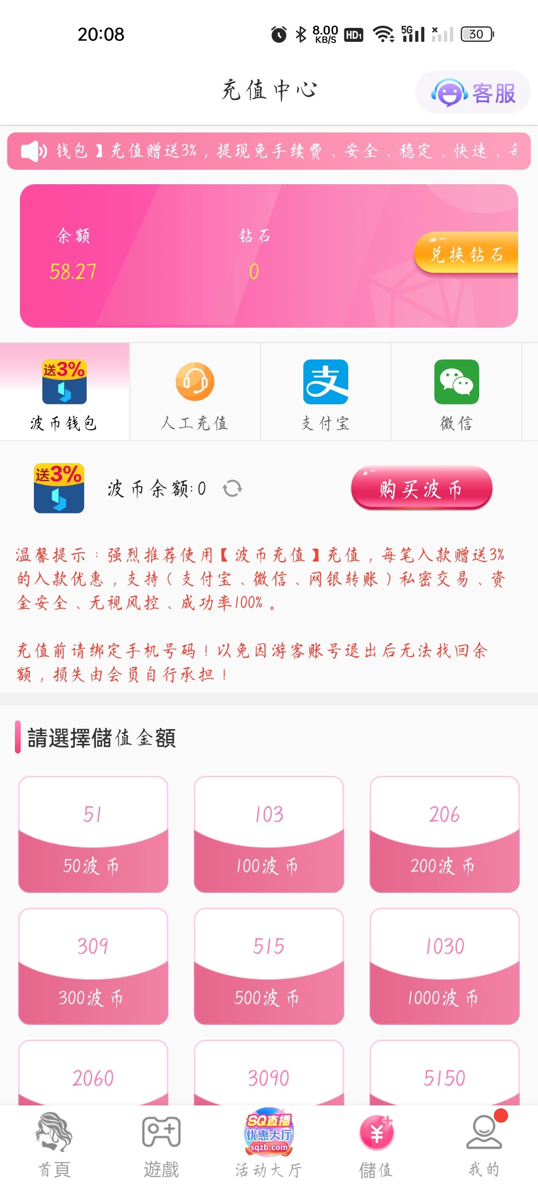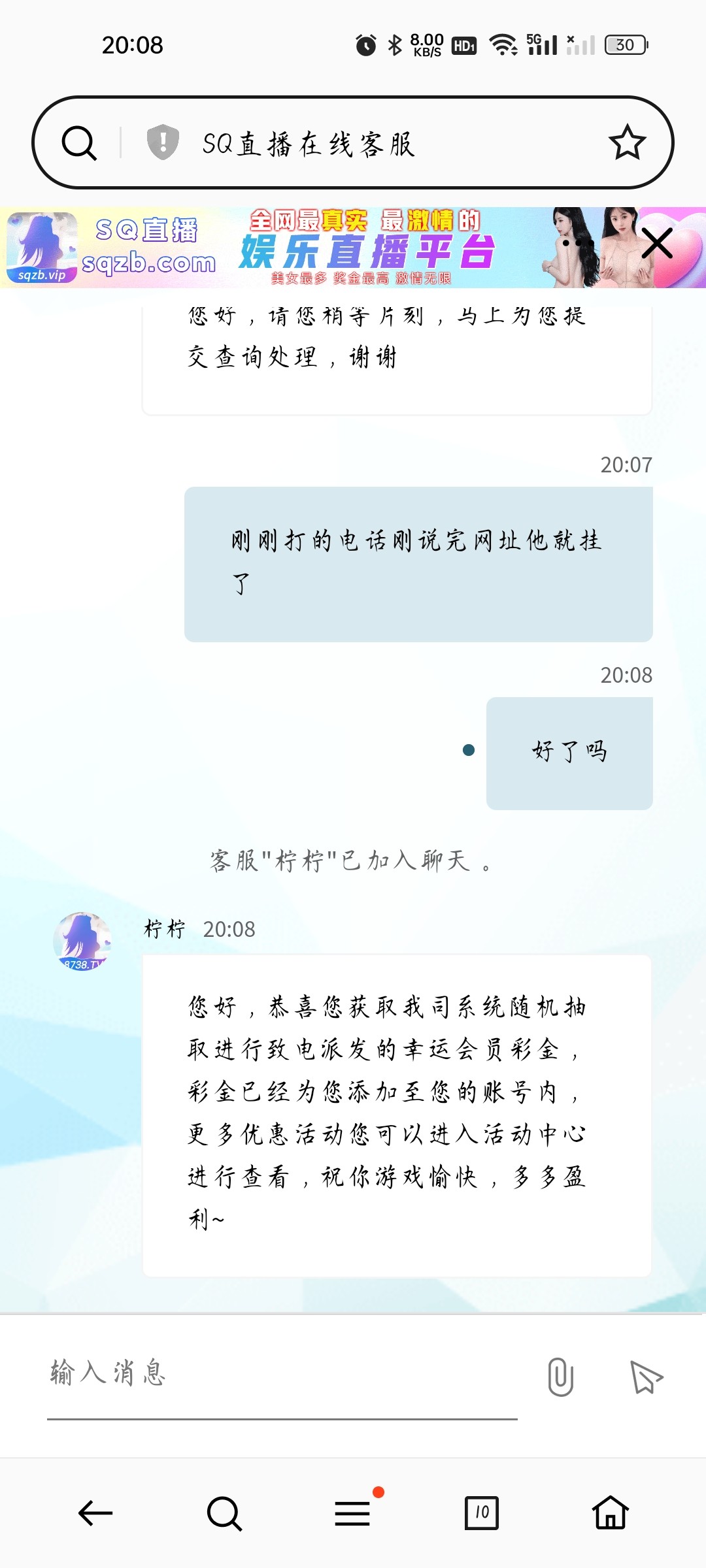 您好,由于活动过于火爆,电话特邀彩金已派送完了,SQ娱乐直播平台最新活动注册首存100送38,最高赠送888欢迎您参与,波币充值每笔加赠3%,更多活动请点击优惠大厅查看哦,谢谢!