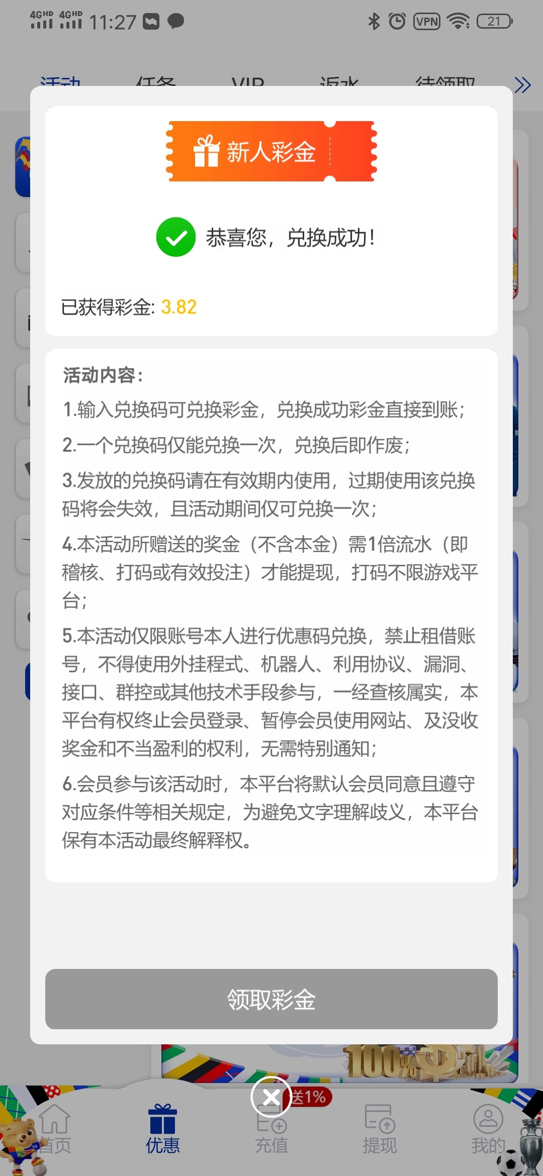 3块2 0.4一次 3把进胡 给了120 后面到130提了 提银行卡被取消 我还以为要黑 也没联系客服直接绑钱能提了 2分钟到账 然后充30几把8毛一把又进胡了 给了80多 到100我又提了 到账后又冲进去50 1.2一把 几把又给我进胡 给了300多 到400又给提了 最后充100 还给400块 等于来回彩票900