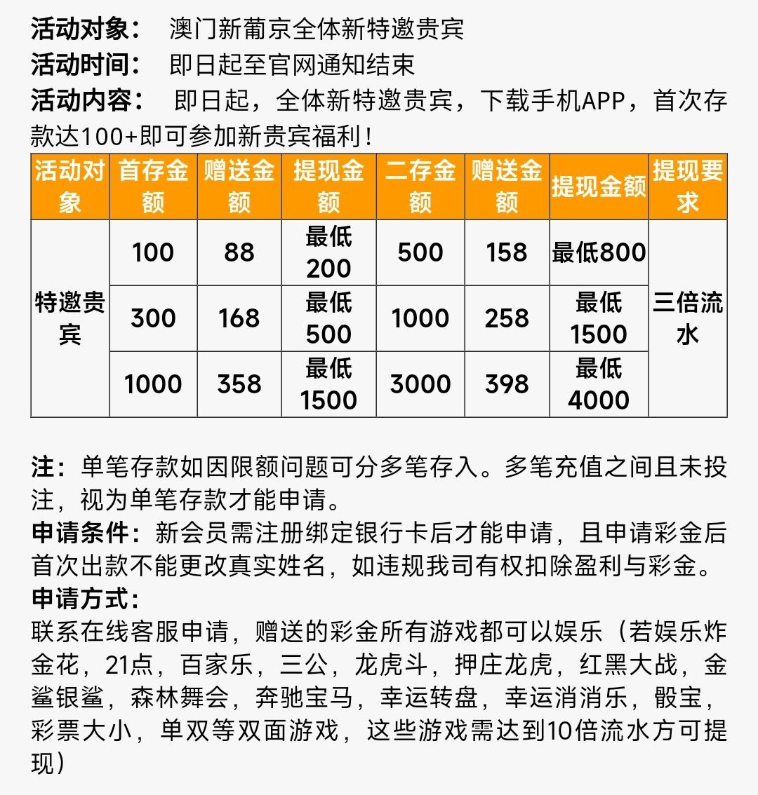 首存100+88,200提现,三倍流水,限制电子捕鱼棋牌,双面盘10倍流水,虽然是特邀送的,这种基本上都能申请到,只要玩过这种模板台子的。找客服申请,发ID跟手机号就行了。