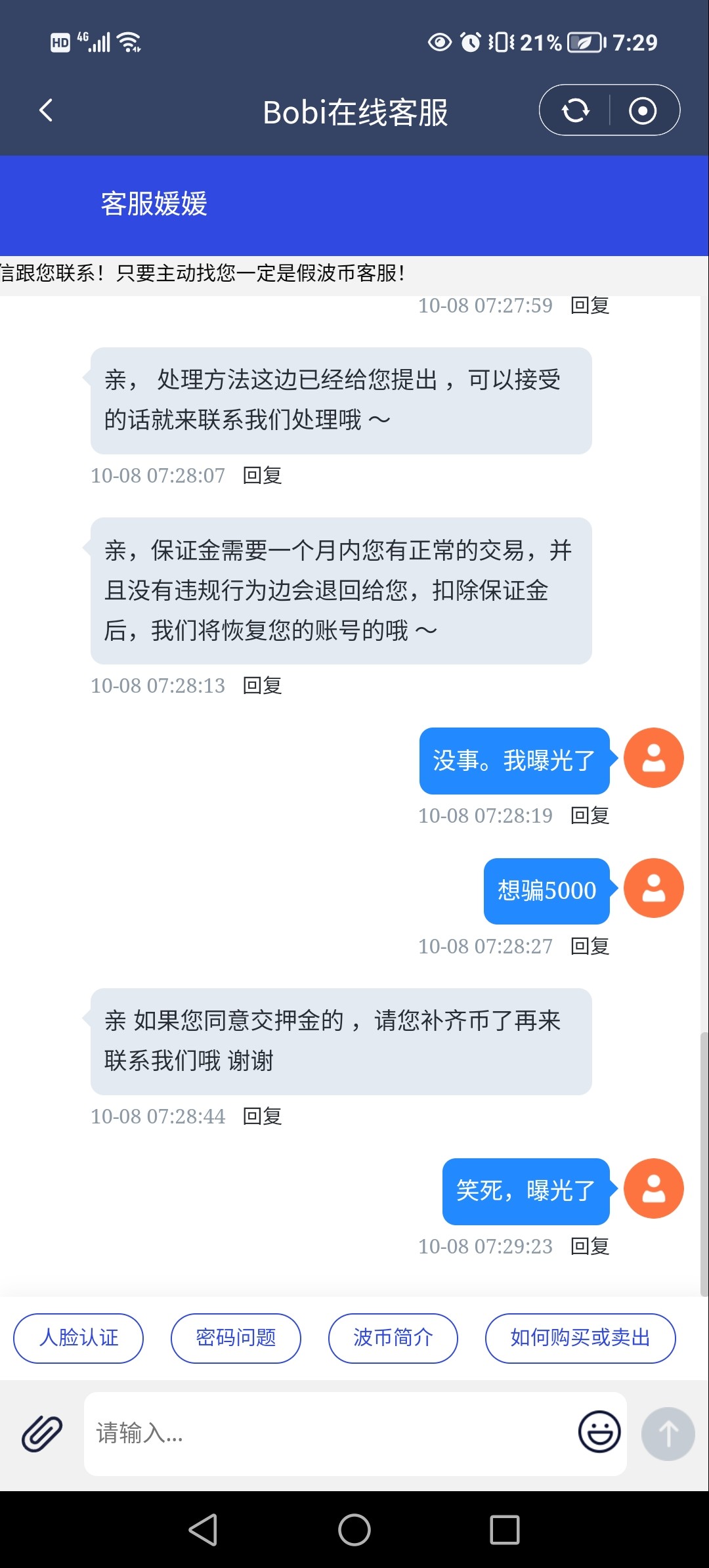 提现100到波币直接冻结,然后说不让解除,解除教5000保证金,问题要游戏提现5000,说我其他号骗单,我问客服什么时候,那个号,就是无线重复一句话