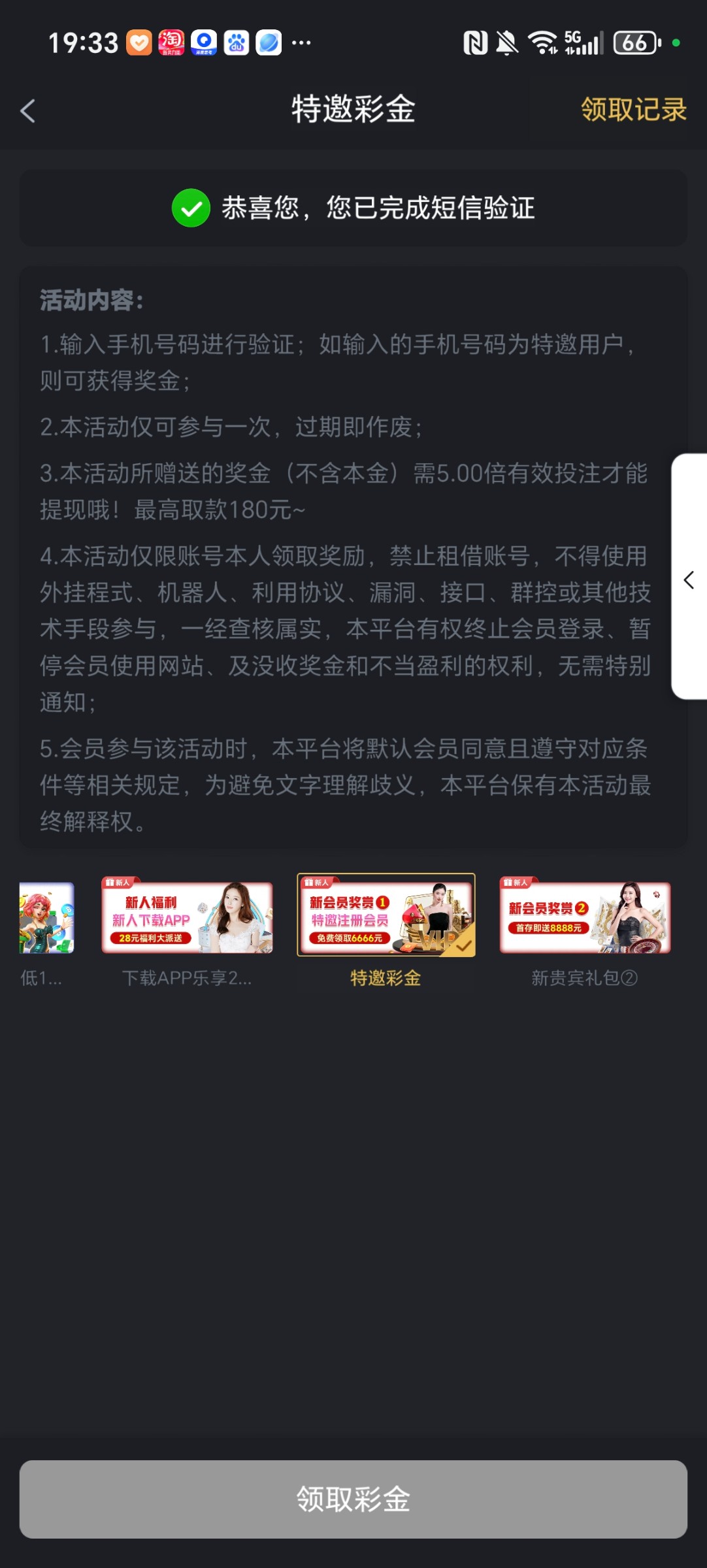 注册下载登录app,打开新人找到手机验证输入手机号领取,应该是随机送的自己去试试最多提180提款自测没发出来我
