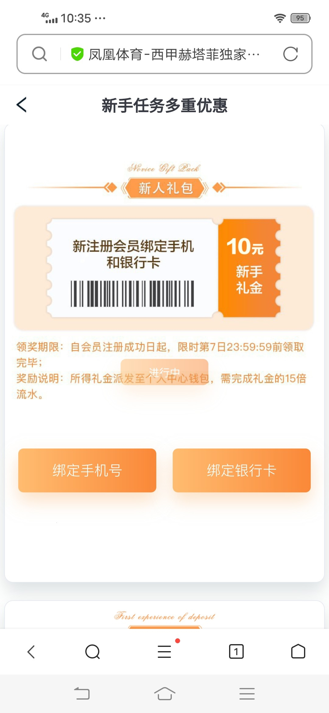注册绑定手机号和银行卡,优惠里新手任务自助领取10元彩金,最低100提现,没有游戏限制15倍流水即可出款。