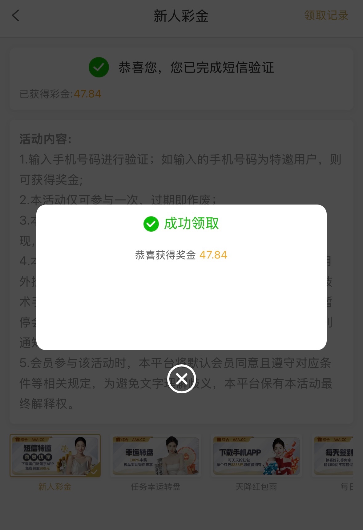 新用户注册优惠里面自助发送短信领取送9-999 应该特邀才有 没有就无视