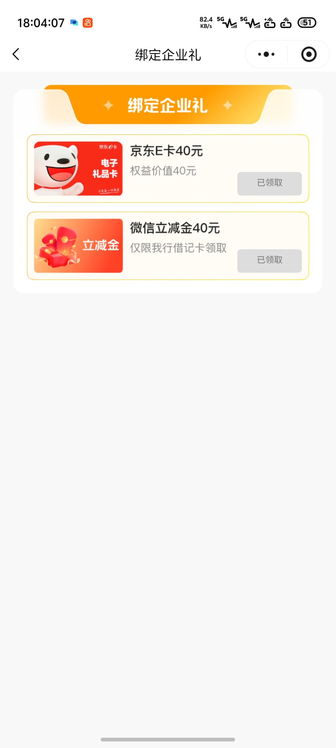 免费领取40微信立减金,或者京东E卡