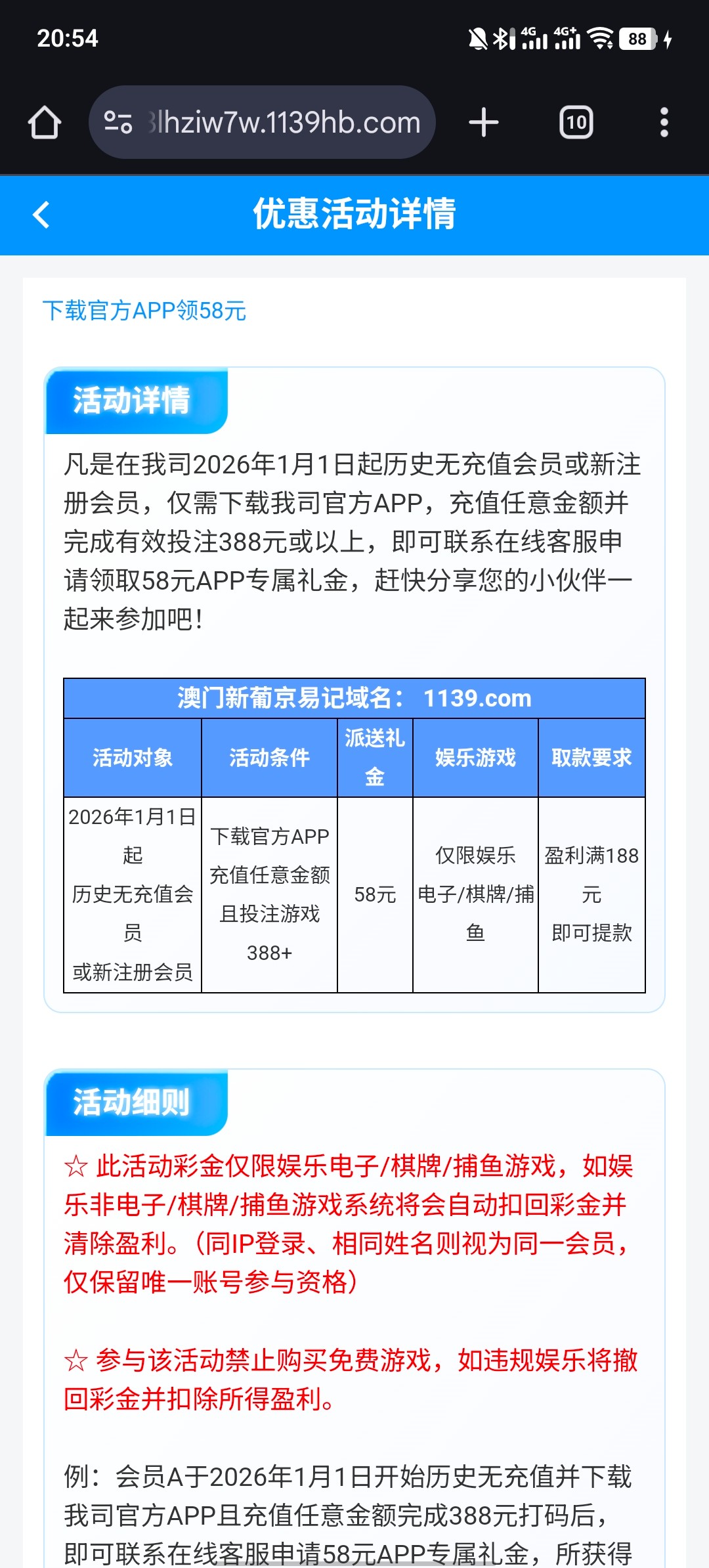 凡是2026年1月1日起历史无充值会员或新注册会员,仅需下载APP完成有效投注388元或以上,即可联系在线客服申请领取58元APP专属礼金