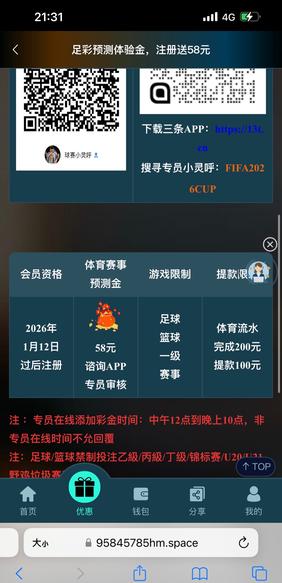 联系专员送58体验金,限制看图片,我注册时间过了不符合,链接CG99.TOP