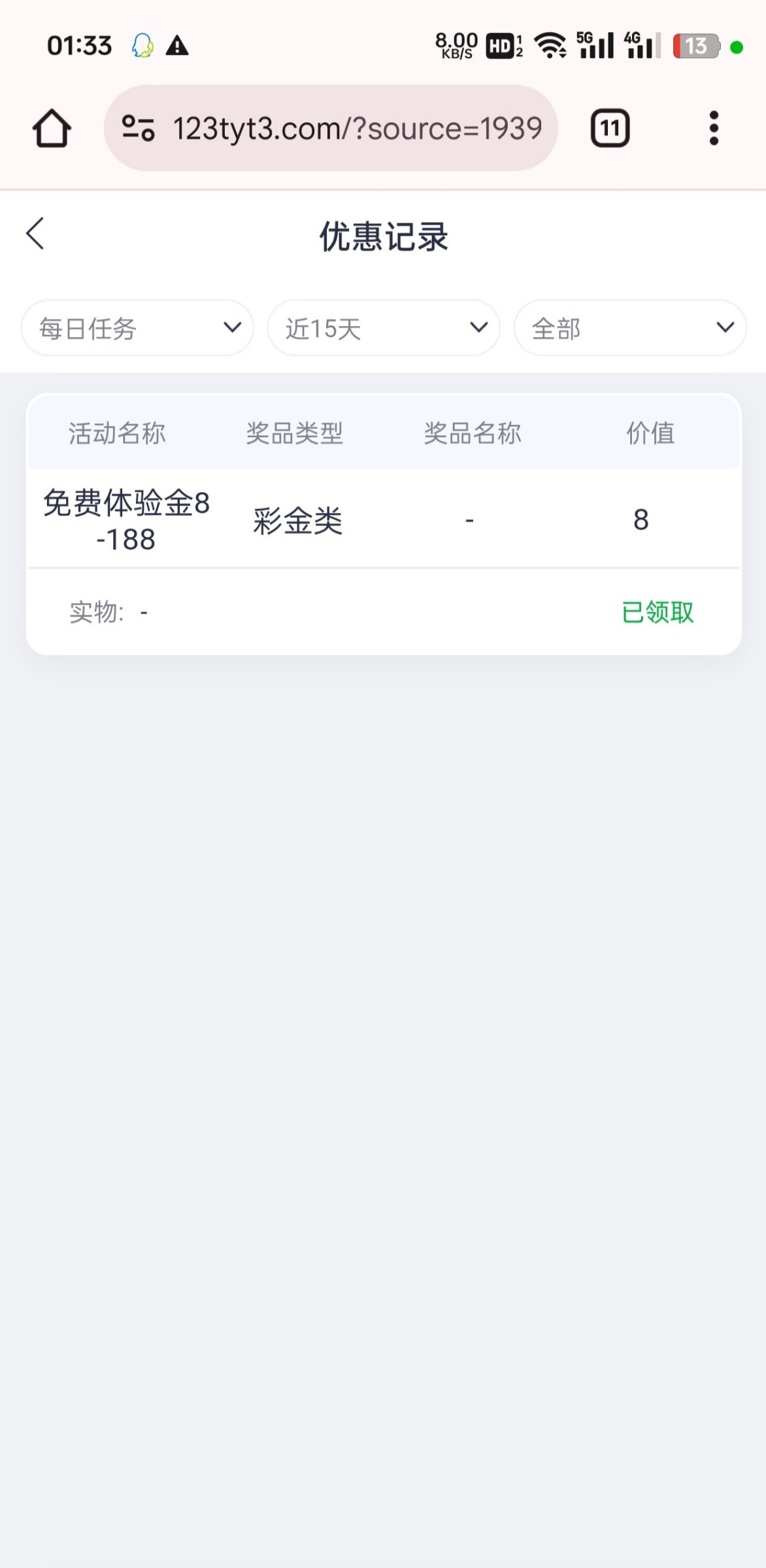 之前注册过的可以去重新注册数据已经全部清空了我以前注册过,发现能重新注册了又领取了8,优惠任务里面领取,绑定好信息刷新一下就有了,这台子有点黑看运气出款的不要充值,网址是:123ty.vip