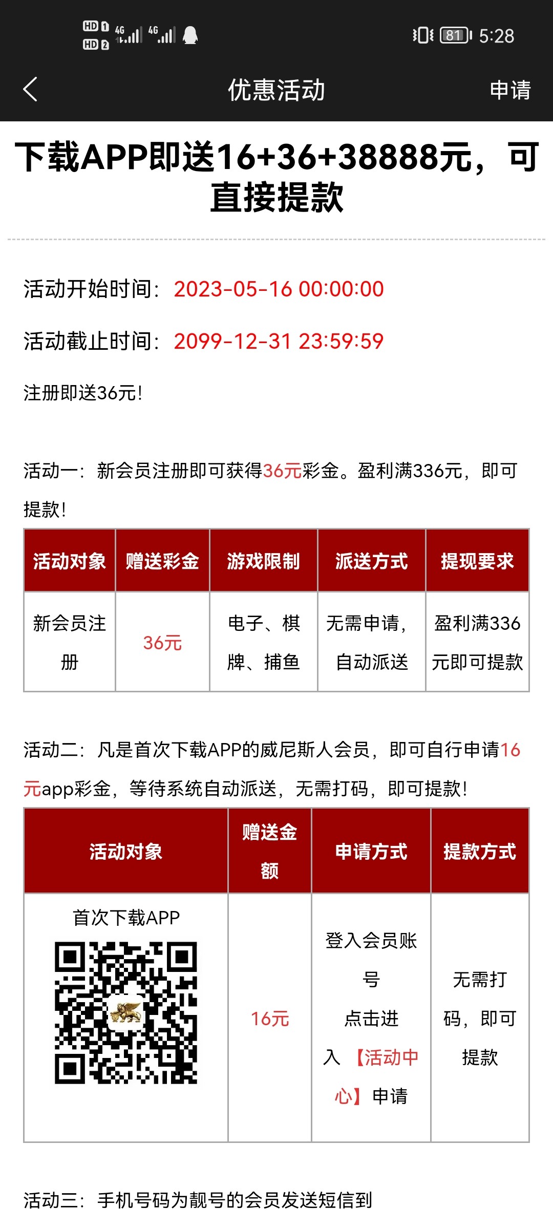 注册就送38下载送16。新出的台子
