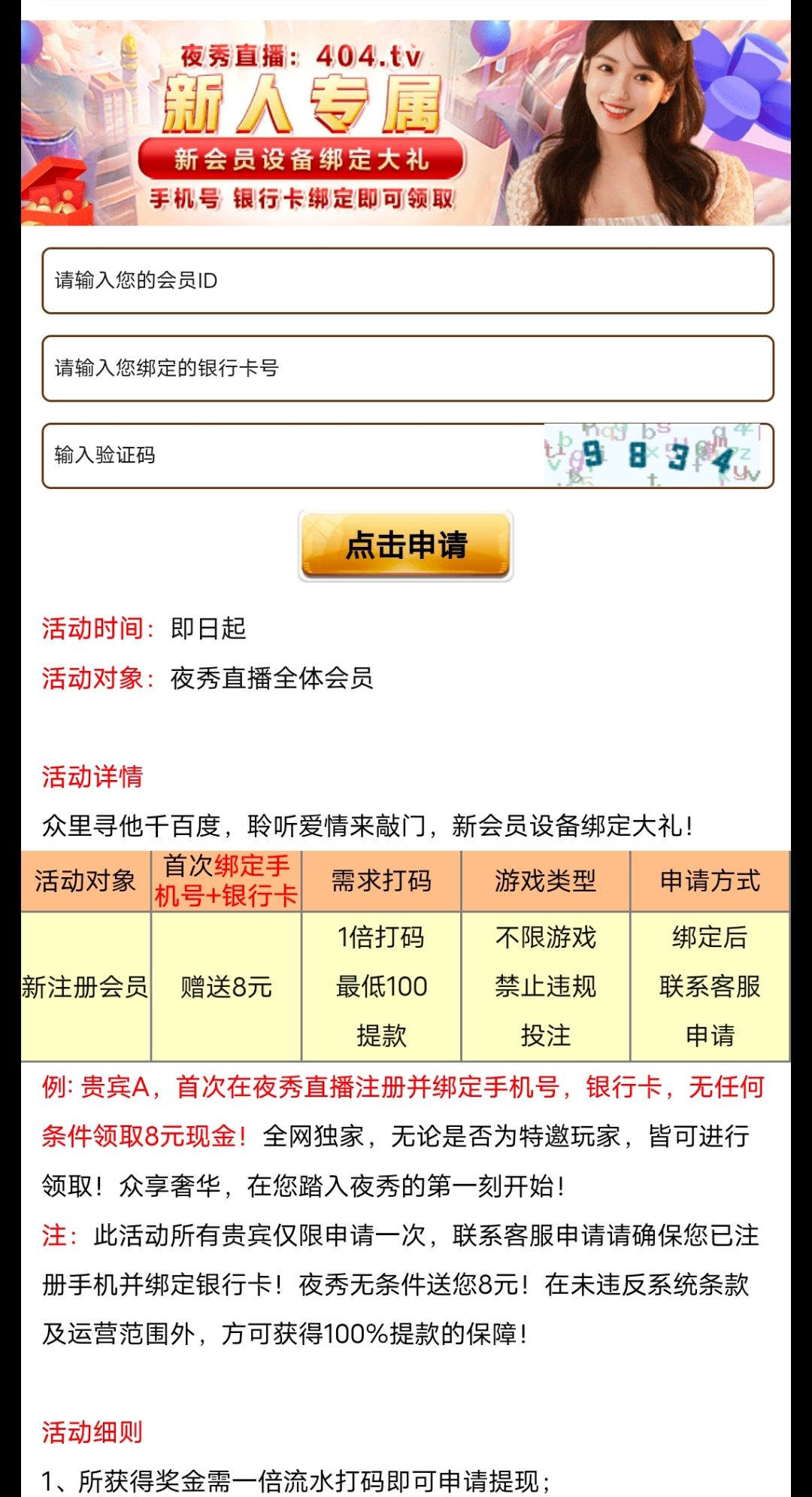 活动:新用户注册绑卡优惠大厅新人活动自助申请8元彩金满100即可提现 这种直播平台是改名不知道发过没自测吧